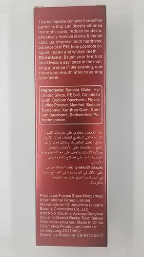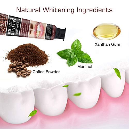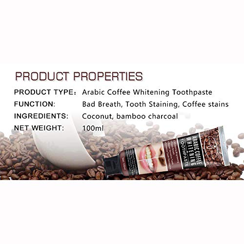 Details: Description: Whitening toothpaste with coffee extract 100 ml. Whitening toothpaste helps remove plaque by preventing tartar formation and provides fluoride support to protect your teeth from decay. Helps get rid of stains and prevent tooth decay. Effect: whitens teeth, removes tooth stains, freshens breath.