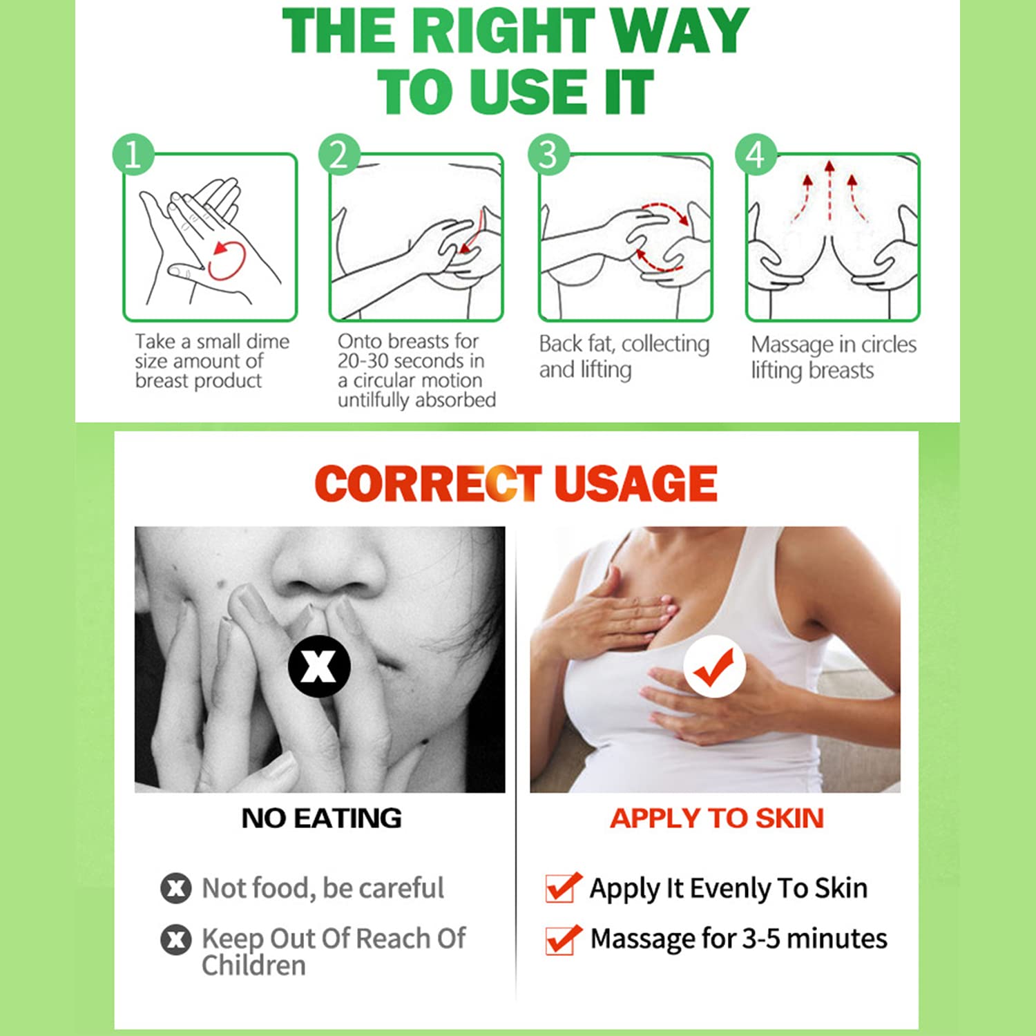 - Usage: After bathing, put proper amount of this product into your palm, avoid your nipples, apply it evenly to your breast and massage for 3-5 minutes using the circular motions until complete absorption.