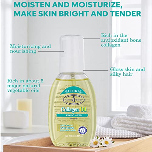 - Collagen Oil Kojic Acid for Hair & Skin is packed with essential nutrients, including collagen, kojic acid, and vitamin E. Collagen is the main structural protein in your hair and skin, and it helps to keep them healthy and strong. Kojic acid helps to reduce the appearance of spots, age spots and uneven skin tone. Vitamin E is a powerful antioxidant that helps to protect your skin from damage caused by free radicals.