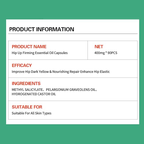 Details: Buttocks Lifting Firming Essential Oil Capsules Improve hip dark yellow & nourishing repair enhance hip elastic Usage: After skin cleansing, apply proper amount of this product to your buttocks and thighs, massage and lift in a circular motion until it is slightly warm and absorbed. Use twice a day. Use after bathing for better results. Ingredients: Ethylhexyl Palmitate, Caprylic/Capric Triglyceride, Vitis Vinifera (Grape) Seed Oil, Methyl Salicylate, Pelargonium Graveolens Oil, Hydrogenated Castor Oil, Mentholum, Tocopheryl Acetate, Vanillyl Butyl Ether. How to Use: Twist off the neck of the capsule by hand or cut open the top of the capsule with scissors and squeeze out the contents into the palm of your hand to use. Precautions: Store in a cool, dark, dry place. Keep out of reach of children. Avoid direct sunlight and accidental ingestion. Attention: 1. If the product gets into eyes, rinse immediately with water. 2. For external use only. In case of any discomfort, disco- ntinue use immediately.