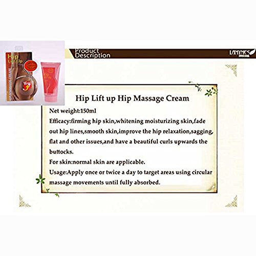 Details: Description: The hip lift up massage cream is for all women who dream of having beautiful hip. It helps firm and enhance your buttocks with exclusive complex of active and natural ingredients. Its lift action can instantly tighten the tissue of the hip and helps effectively fight gravity, provide elasticity and support, firm and smooth the skin. Product Name: Hip Lift up Hip Massage Cream Net weight: 150ml. Shelf Life: 3years. Efficacy: firming hip skin, moisturizing skin, fade out hip lines, smooth skin, improve the hip relaxation, sagging, flat and other issues, and have a beautiful curl upwards the buttocks. Ingredient: hamamelis extract (hamamelis Virginian) extract, Piermaria extract (Piermaria lobate), angle au alkane, gold sweet scented Osman thus, marine collagen (marine collagen), sweet almond oil. For skin: normal skin is applicable. For the crowd: 1, flat hip crowd; 2, shriveled hip crowd; 3, abundant buttocks surgery failed crowd; 4, the pursuit of perfection hip crowd. Usage: Apply once or twice a day to target areas using circular massage movements until fully absorbed. Caution: For external use only, keep the product in a cool place and away from children.