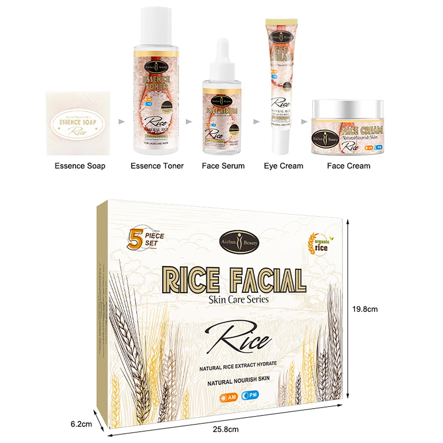 AICHUN BEAUTY Organic Rice Facial Skin Care Set Hydrate Rejuvenating Essence Soap Toner Face Serum Eye Cream Gift Box 100g+100ml+40ml+50ml+25ml 5PCS