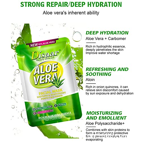 - Disaar Aloe Vera masks are enriched with moisturizing ingredients and have a refreshing oil-free texture to deeply moisturize, promote the generation of collagen in the skin, repair sunburn, minimize pores, eliminate acne and wrinkles, restore hydrated, shiny and energetic skin.