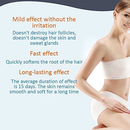 - Mild effect without the irritation Doesn't destroy hair follicles, doesn't damage the skin and sweat glands Fast effect Quickly softens the root of the hair Long-lasting effect The average duration of effect is 15 days. The skin remains smooth and soft for a long time