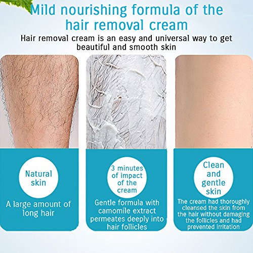 - A large amount of long hair. 3 minutes of impact of the cream Gentle formula with camomile extract permeates deeply into hair follicles Clean and gentle skin.